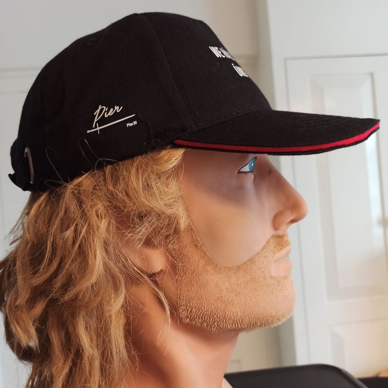 Deze verstelbare pet is van katoen en heeft een rood randje langs de klep.